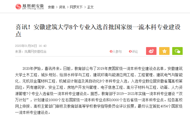 编者按:日前,教育部公布了2019年度国家级一流本科专业建设点名单,我校共有8个本科专业入选,入选专业数位居安徽省属高校第四位。凤凰网安徽对此进行了报道。