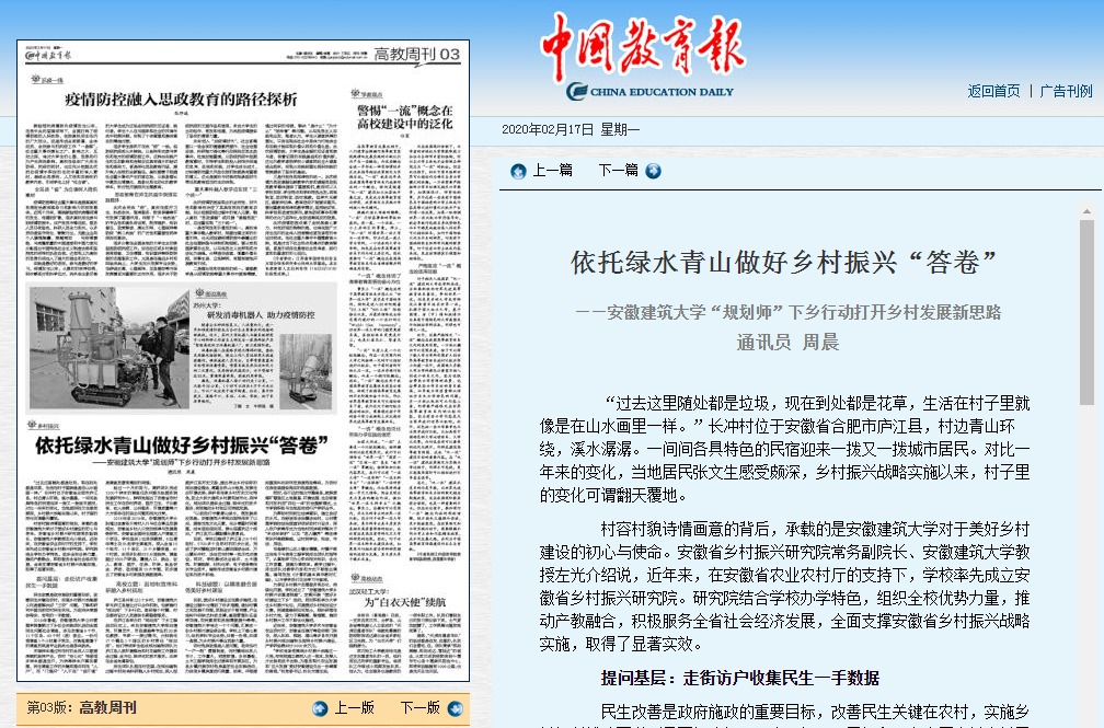 目前,学校已推进了庐江县216个行政村、5700多个自然村的初步分类,完成了罗河镇鲍店村黄山寨田园综合体、万山镇长冲村、汤池百花村等一批示范点建设。同时,学校集成社会经济、土木建筑、环境能源、材料化学、电子信息等相关专业技术,编制形成安徽省乡村振兴建设系列技术标准。
