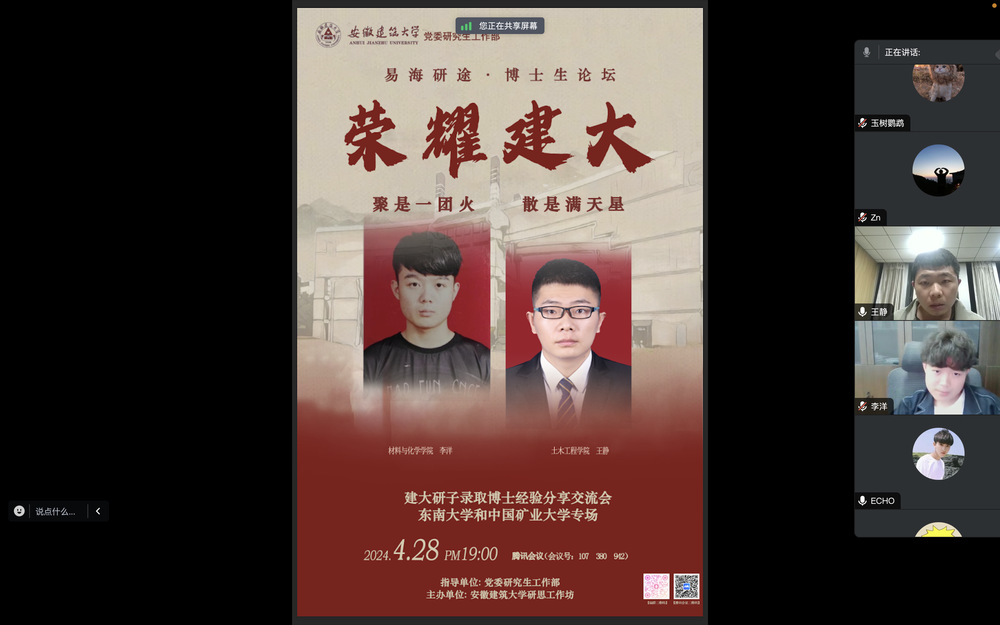 4月29日,研工部在线上开展第2期考博经验分享会。本期分享会邀请了我校2位成功考取东南大学和中国矿业大学的博士生们分享考博经历。