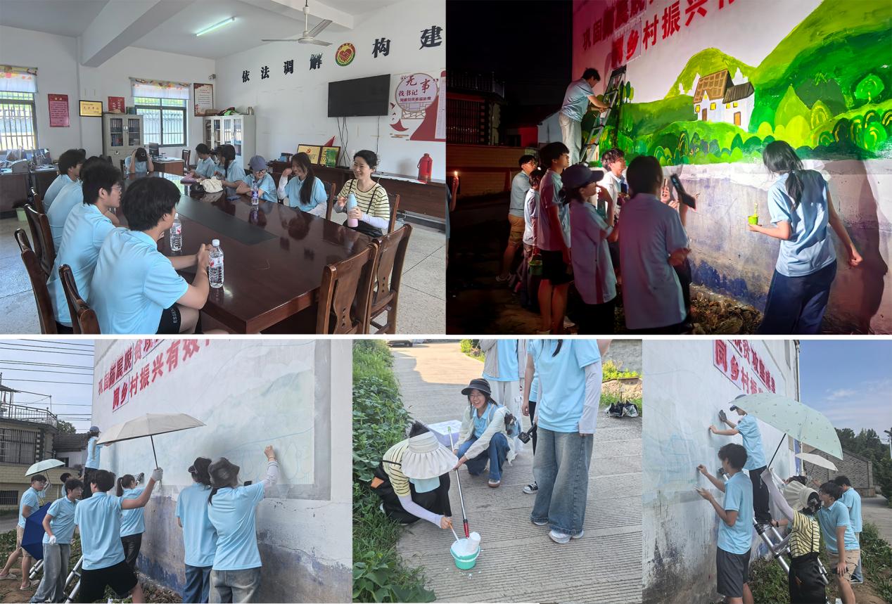 此次艺术学院“三下乡”实践活动,共完成汤池村特色墙绘与五里桥村3面近250平方米的主题墙绘,不仅为乡村“美颜”,更以艺术为桥宣传党的方针政策、凝聚群众力量。