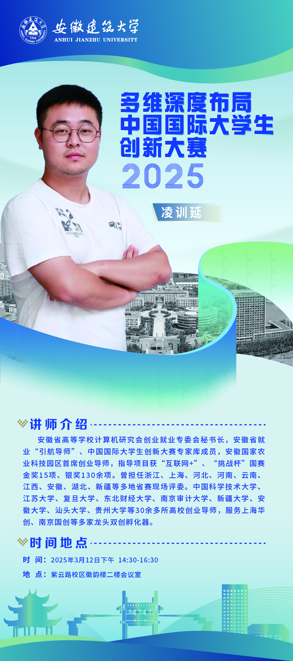 为扎实做好中国国际大学生创新大赛(2025)组织工作,学校定于3月12日(周三)下午2:30—4:30,在紫云路校区徽韵楼二楼报告厅启动中国国际大学生创新大赛(2025)校内选拔赛。